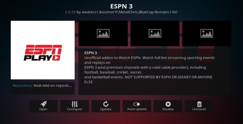 ESPN3 began as ESPN’s standalone streaming service but has largely been absorbed into ESPN+.\nAn ESPN3 addon still exists and can deliver streams if you already have an ESPN3/ESPN+ account.\nFull live games and most advanced features require you to authenticate your account and authorize the device through the addon.\nIf you don’t sign in, the addon still provides limited free content — replays, highlights and on-demand clips from across ESPN’s sports coverage.\nMost material is restricted to viewers in the United States, so a VPN is typically necessary to view either free or paid content from outside the US.\nIn short, the addon is most useful for logged-in users seeking live events; for others it’s primarily a source of catch-ups and highlights.